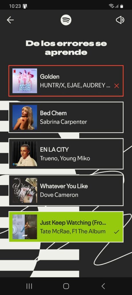 Otro de los hallazgos de este año es la gamificación de una parte del carrusel. El Wrapped te plantea un pequeño quiz sobre tu canción más escuchada. Se trata de un detalle puntual, pero convierte una experiencia que de otro modo habría sido pasiva en un juego participativo.
