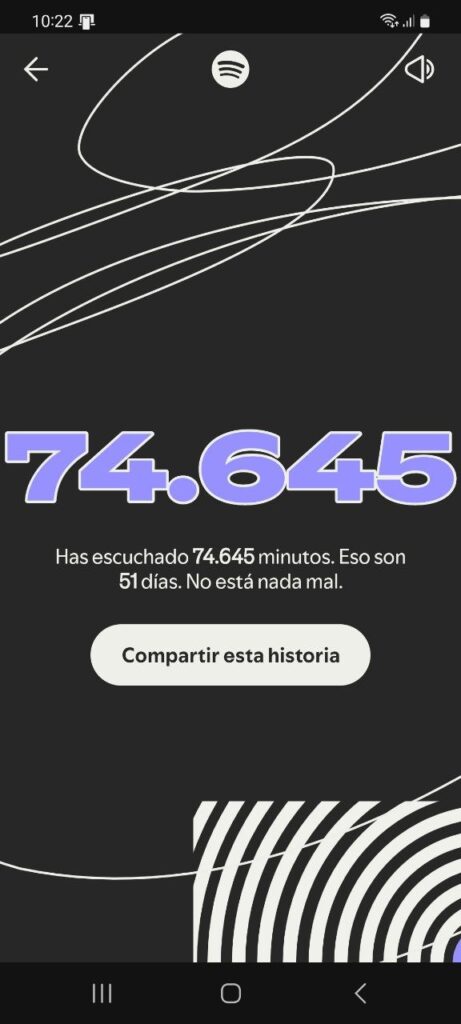 El carrusel complementa las listas cuantificando el tiempo total que hemos dedicado a escuchar música en la plataforma. Como en el año 2023, el Wrapped calcula los miles de minutos que has pasado en Spotify y lo traduce a una medida cotidiana que resulta comprensible para sus usuarios: “Has escuchado 74.645 minutos. Eso son 51 días. No está nada mal”.