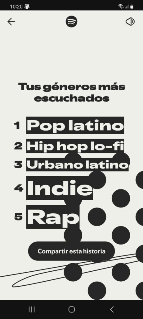 No obstante, la estrategia de socialización más relevante del Wrapped de Spotify es, como cada año, su facilidad para compartir cada fragmento del carrusel y, en particular, el resumen anual con los principales datos de interés. En él se condesan la lista de artistas y canciones que más se han escuchado, el volumen total de minutos invertidos en la plataforma y, a diferencia de lo que sucedió en 2024, el género que más sonó en todo el año. Este último detalle supone otra mejora con respecto al Wrapped anterior por las razones de perfilado identitario y construcción de la identidad social que ya hemos mencionado.